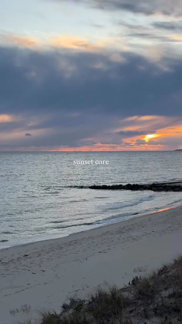 A woman with red hair looking to the side while sitting on the beach during sunset or sunrise with clouds in the sky and waves behind her.
